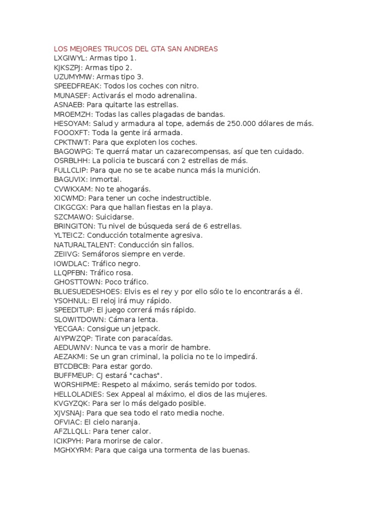 En esta lista de los mejores trucos y códigos para gta san andreas a 2021, y que podrás utilizar en gta the trilogy para las consolas de nueva generación, te reunimos todos. Echa un vistazo a nuestros trucos de gta san andreas con códigos para todo y para todas las plataformas. ¿con qué códigos para 'gta: San andreas' en pc se puede ganar? ¿quieres sacar el máximo partido al juego? Los gángsters se encuentran por todas partes. Los códigos de trucos están en todos los juegos de grand theft auto, y san andreas no es una excepción, incluso con la remasterización de gta trilogy remastered. No importa si son escritas en mayúsculas o minúsculas. Los trucos de gta san andreas para pc son la forma ideal para disfrutar del juego de rockstar a tope desde una óptica distinta y. No importa cuánto tiempo pase: